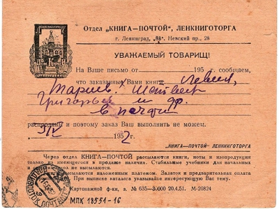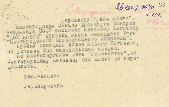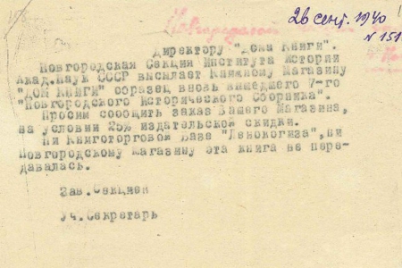 Новгородская секция Института Истории Акад. Наук СССР высылает Книжному Магазину «ДОМ КНИГИ» образец вновь вышедшего 7-го "Новгородского Исторического Сборника". Просим сообщить заказ Вашего магазина, на условии 25% издательской скидки. Ни Книготорговой Базе "Ленокогиза", ни Новгородскому магазину эта книга не передавалась.