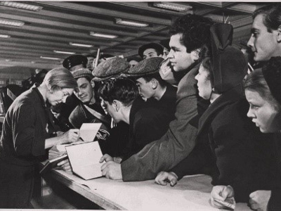 После войны «Дом книги» закрывался на ремонт. В сам «Дом книги» снаряды не попадали, но были небольшие разрушения от снаряда, который попал в соседний дом. После этого ремонта на полу появился паркет, пропали светильники у входа. Но сам магазин не изменился. Работники продолжали придумывать новые мероприятия: ввели календарь новинок, встречи с писателями, тематические недели, обзоры книг, начали принимать заказы на книги. Появился институт подписки – можно было заранее вложить небольшую сумму в издание книги и получить ее через некоторое время. Ежедневно магазин посещали 30-40 тысяч покупателей. А вот как проходил День поэта в «Дом книги». На фото Ольга Берггольц дает автографы.
