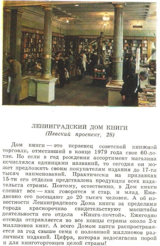 Хочется начать этот раздел про духовные ценности с лиричного предисловия. Дело в том, что «Дом книги» - это не просто набор артикулов, цифр и большие продажи. Это уникальное место. Он был очень любим многими поколениями ленинградцев. Сейчас, в эпоху потребления, это сложно представить, но это был не совсем магазин. Сюда заходили погулять, посмотреть что-то интересное, познакомиться с новинками литературы. Это было место, полное книжных запахов и увлечений. Здесь прохаживались по залам, назначали встречи и свидания у памятника Ленину. Нередко обычная прогулка горожанина по Невскому заканчивалась погружением в атмосферу «Дома Книги». Мы в детстве одни или с друзьями заходили в «Дом книги» просто посмотреть на интересное. Я думала, это было только у нас, но как-то спросила подругу на 10 лет старше, оказалось, что они тоже так же бегали в «Дом книги». Причем ей больше всего запомнилась большая географическая карта. Совпадение или судьба, но она закончила географический факультет и стала учителем географии. Во время работы над текстом спросила свою бабушку 1932 г.р., что она помнит об этом здании. Оказалось, что бабушка, будучи студенткой, в 1950е годы с друзьями ходила посмотреть новые книги точно так же, как и школьники 1970-90х. Она даже вспомнила анекдот своей молодости: