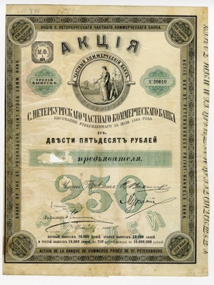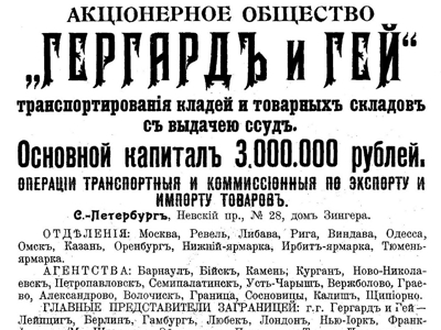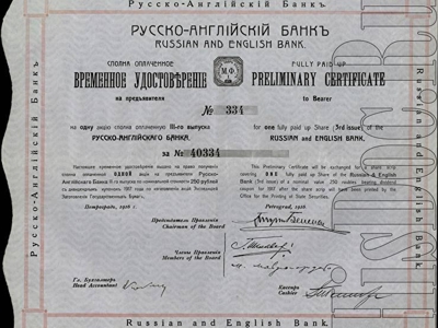 Большое помещение второго этажа, над выставочном залом "Зингера" арендовал "Всероссийский банк для хлебной торговли", который был в 1911 году переименован в Русско-Английский банк. Это банк был основан в 1910 году финансистами Великобритании. Среди учредителей этого банка были граф Бальфур, Остин Чемберлен и Джеймс Вишау, предприниматель и нефтепромышленник. Благодаря этому Русско-Английский банк «пользовался колоссальным доверием финансовых кругов Лондона». Согласно уставу, Банк мог производить покупку и продажу перемолоченных хлебных товаров и др. сельскохозяйственных продуктов, драгоценных металлов, государственных процентных бумаг, акций и облигаций. После учреждения Англо-Русский банк купил почти 30% акций "Русского торгово промышленного банка" (пятого в стране). Последним директором и председателем правления банка был Г.И. Бененсон (на фотографии ниже), потомственный купец (1-й гильдии). Как представитель банка принимал участие в покупке британскими бизнесменами Ленского золотопромышленного товарищества. В газетах сохранился любопытный эпизод - в 1914 году в пригородном поезде около станции Лигово Бенесона из ревности облила серной кислотой его любовница Шмулевич. Понадобилась госпитализация. Бенесон вообще был интересной личностью. Подробно о нем здесь https://scinetwork.ru/articles/25631