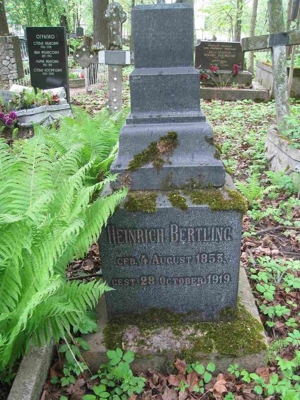 Правда, компания недолго спокойно жила в этих стенах. С началом Первой мировой войны ее обвинили в шпионаже, было заведено уголовное дело, в здании прошли обыски, но несмотря на существующие до сих пор слухи в реальности никаких доказательств вины сотрудников компании обнаружено не было. Если верить разным источникам, после этого директор отделения, приехавший из Германии немец Бертлинг, сбежал за границу, предоставив свою дачу большевикам, которых, возможно, через него финансировали. Однако рижский немец Бертлинг в действительности никуда не уезжал, он умер в 1919 году, его могилу можно увидеть на Смоленском лютеранском кладбище Петербурга (на фото), недалеко от могилы архитектора Сюзора, который скончался за 4 месяца до него. Кстати. рядом с ними похоронен и один из директоров Частного коммерческого банка, О. Липпе. На даче Бертлинга (на фото), действительно, собирались большевики в октябре 1917 года, но неизвестно, знал ли об этом сам хозяин.