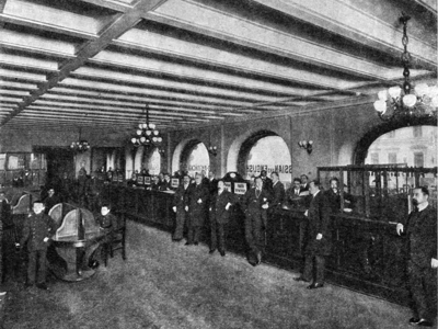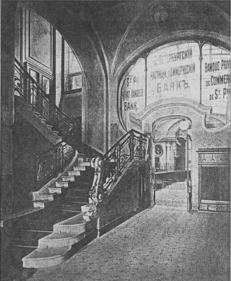 «Там Невский в блеске и тоске, В ночи переменивший краски, От сказки был на волоске, Ветрами вея без опаски. И как бы яростью объятый, Через туман, тоску, бензин, Над башней рвался шар крылатый И имя «Зингер» возносил.» Николай Заболоцкий (Вечерний бар, 1926 г.) Изначально на первом этаже здания был выставочный зал компании «Зингер». Администрация компании занимала самый верхний этаж, а остальные помещения сдавались банку, страховому обществу и другим организациям. Соседний (внутренний) зал на первом этаже занимал "Санкт-Петербургский частный коммерческий банк" — первый российский акционерный коммерческий банк. В 1900х годах входил в первую десятку крупнейших банков России. Одним из учредителей и председателей правления банка был Г.П, Елисеев (один из основателей торгового дома «Братья Елисеевы»), позже председателем был и сын Елисеева. Банк имел право выдавать ссуды в неограниченном размере, принимать в залог недвижимое имущество. В Доме Зингера располагалось правление банка. В то время председателем и директорами правления банка некоторое время был В. Ковалевский (на фотографии ниже), один из создателей Санкт-Петербургского политехнического института, председатель Русского технического общества. Всего при его содействии в различных регионах России было создано свыше ста профессиональных школ различного типа, 73 коммерческих училища, несколько художественно-промышленных училищ, открыто 35 училищ торгового мореплавания. До него директором был О. Липпе, председатель Общества взаимного кредита. А с 1909 председателем и директором банка был А. Давидов, в юности увлекавшийся музыкой, один из учредителей Петербургского общества музыкальных собраний, участвовал в постановке опер "Псковитянка" и "Борис Годунов".
