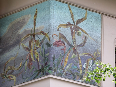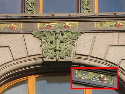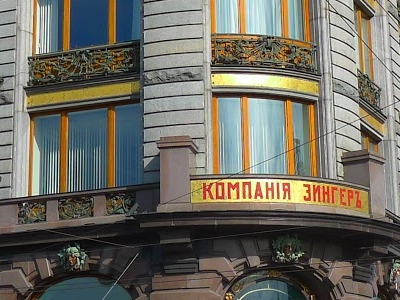 Владимир Фролов - создатель мозаик Дома Зингера. Это, конечно, не самая значимая его работа, но без этих мозаик здание смотрелось бы не так ярко. Мозаикой выложены полосы с названием компании Зингер на золотом фоне, золотые полосы под французскими балконами (их можно увидеть на фотографии ниже), а также есть мозаичные вставки с цветами над окнами пятого этажа. Они довольно высоко, поэтому их редко вспоминают, между тем они придают яркость верхней части здания.