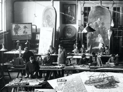 Владимир Фролов, автор всех мозаик дома Зингера, родился в 1874 году в семье мозаичиста Фролова. В семье был еще брат на 13 лет старше, который вошел в семейное дело и активно помогал отцу, но брат рано умер, и Владимиру вместо образования в Академии Художеств пришлось заменить брата в мастерской отца. На тот момент отцу самому было уже к 70-ти, поэтому основная часть труда легла на плечи Владимира. Еще до смерти брата мастерской удалось получить огромный заказ по отделке и оформлению Спаса на Крови, и так получилось, что выполнять заказ пришлось еще не вполне опытному Владимиру. Сложно представить, чего ему это стоило, но он прекрасно справился и с художественной частью, и с технической, и с управлением работниками, хотя мозаики этого собора одни из крупнейших в Европе - 7065 квадратных метров. Помимо работы над грандиозными мозаиками Спаса на Крови мастерская под его руководством в те годы украсила мозаиками особняк Набоковых на Морской улице, особняк Рябушинского в Москве, Доходный дом герцога Лейхтенбергского на Большой Зеленина. А после Дома Зингера компания 10 лет изготавливала масштабные мозаики для Морского Никольского собора в Кронштадте и много других мозаик для самых неожиданных уголков Российской империи. Например, мозаики Фролова украшают Георгиевский собор в Гусь-Хрустальном (сейчас там находится уникальный Музей хрусталя). Вскоре после выполнения мозаик Дома Зингера в 1905 году Владимир породнился с семьей Бенуа - женился на дочери архитектора Леонтия Бенуа, Нине. Это был счастливый брак, в котором родилось трое сыновей.