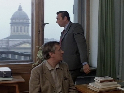 После войны в здание переехали десятки новых издательств. Так, новыми обитателями стали: «Молодая гвардия», «Мир», «Искусство», «Художественная литература», «Просвещение». А еще как выглядели редакции в конце 1970х, можно увидеть в фильме «Осенний марафон». Именно сюда, в издательство, приходит герой фильма Бузыкин. Посмотрите на кадры из фильма - судя по всему, сцену снимали в помещении на 5 этаже, с выходом на балкон. Сейчас сложно сказать, кто работал в этом кабинете, но на 3 этаже под ним был кабинет директора «Дом книги», он был первым от углового кабинета с золотой надписью "Зингер" (а в угловом кабинете находилась приемная и кабинет секретаря). Кабинет директора объединения ЛКО "Ленкнига" находился на 5 этаже справа от угла (после приемной секретаря), его окна выходили на Канал Грибоедова, а последним на 5 этаже был кабинет зам. директора объединения.