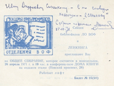 В здании на седьмом этаже регулярно собирались библиофилы. Сохранилось приглашение на собрание-доклад А.П. Ломана "Прижизненные издания произведений С.А. Есенина".