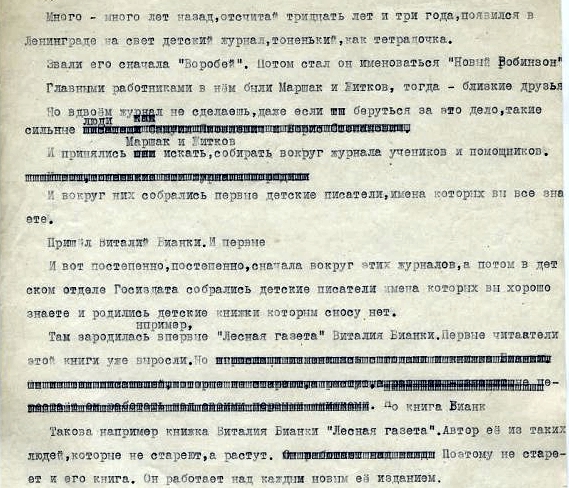 Она была работой счастливой потому, что увлекала автора, редактора и меня, но поначалу ни Митины познания, ни наша увлеченность ни к чему не вели. Вариантов, отвергнутых Маршаком, были десятки, неудачи длились месяцы. Если бы не упорство Маршака, Митя наверное бросил свои старания. При том, что и сам он отличался завидным упорством. Безуспешные попытки написать детскую книгу о спектральном анализе длились и длились. Как я помню бедные Митины листки! Вырваны из блокнота; наверху – зубчики; а буквы и строки бегут мелко и скупо, от края до края, точно опасаются, что им не хватит места… Каждый раз, переписав очередной вариант первой главы, Митя уверяет меня, что лучше, нагляднее, понятнее написать немыслимо. На этот раз Самуил Яковлевич уж непременно останется доволен. Я согласна с ним. Веселыми ногами идем мы в Дом Книги, на Невский, минуем вращающуюся стеклянную дверь и надолго запираемся вместе с Самуилом Яковлевичем в маленькой угловой комнатушке с балконом. Балкон на углу Невского и канала Грибоедова. Клеенчатый казенный диван, канцелярский стол, весь в чернильных пятнах. Вещам и людям в комнатушке тесно: Самуил Яковлевич, Митя и я еле протискиваемся между столом и диваном... Зато запирается комнатка изнутри на замок, тут можно надежно укрыться от редакционного шума. Уличный – трамвайный – не помеха. Митя читает, Маршака не велено звать к телефону. Маршак слушает, опустив на руку большую, круглую, седеющую голову. Слушанье – вслушиванье – для него труд, и труд напряженный. Существует истасканное, банальное выражение: «он весь обратился в слух». Банально; а если отнести к Маршаку – иначе не скажешь. Маршак в самом деле слушает ушами, лбом, подбородком, всеми порами, сердцем. И глазами. Я убеждена: слушая Митин голос, он видит услышанное набранным, напечатанным и уж конечно напрягает все силы, чтобы увидеть не одни лишь графические начертания слов, но и то, о чем речь идет: пробирки, колбы, светящиеся линии. От окружающего он отключен совершенно. Сейчас он не он, а тот двенадцатилетний школьник, который будет эту книгу читать. Он сейчас весь в напряжении: нелегко быть самим собой, весьма искушенным сорокапятилетним литератором, и в то же время нетронутым цивилизацией подростком, нелегко слышать и видеть одновременно. В такие минуты он не замечает ни меня, ни Мити, не слышит ни уличного шума, ни смутного гула разговоров в соседней комнате. Он слышит и видит читаемое – нет Невского, нет канала Грибоедова, нет по соседству телефонных звонков… …Митя кончил. Сложил свои листки. Самуил Яковлевич глядит на него бережно, ласково – я-то уж понимаю: значит, опять не то!Полный текст о работе над "Солнечным веществом" Но труды стоили того. После долгой и кропотливой работы Бронштейна и Маршака была написана и издана в журнале «Костер» одна из лучших книг о физике для детей - «Солнечное вещество». А вот как сам Маршак вспоминал первую работу с Бианки: