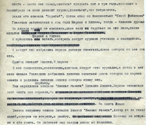 Отношения с редакцией у каждого из них складывались по-своему. Виталий Бианки пришел ко мне со стихотворением в прозе. Не слишком надеясь, что из него выйдет поэт, я стал расспрашивать его, что он знает, что любит, что умеет. Оказалось, этот молодой человек, похожий на артиста-итальянца, - страстный охотник, изучивший повадки и нравы лесных жителей. Интерес к ним привил ему с самого его детства отец, известный профессор-орнитолог. Подумав, я предложил Бианки попробовать писать о том, что он знает лучше всего - о зверях и птицах. В то время о животных писали либо толстовцы - на тему: жалейте всякое живое, хоть и бессловесное существо, или люди, смотревшие на зверей с точки зрения Пушторга. Сюжетных детских книг о жизни животных - таких, какие писали Сетон-Томпсон или Вильям Лонг, у нас тогда почти не было. И в самом деле Виталий Бианки вскоре написал несколько острых и забавных рассказов, которые и до сих пор читают дети - "Лесные домишки", "Кто чем поет?", "Чей нос лучше" и другие.Подробнее о работе Маршака с молодыми писателями можно почитать на отдельной странице. Чтобы прочувствовать то время, давайте послушаем рассказ писателя Андронникова о том, как он начинал работать в издательстве в 1930м и посмотрим интерьеры Дома Зингера 1970-х. Обратите внимание, что лифты тогда еще работали. В некоторых источниках пишут, что это не так.